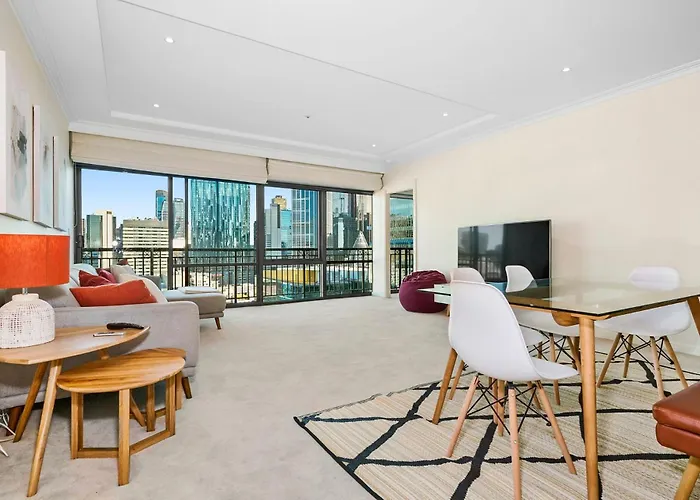 広々とした98m²のメルボルンHorizon On Russell - With Indoor Pool And Gymアパートメントは住宅街に位置し、クックズコテージから徒歩で15分で、コリンズ・ストリートから1kmです。 ビジネスでもレジャーでもWiFiを利用することができます。